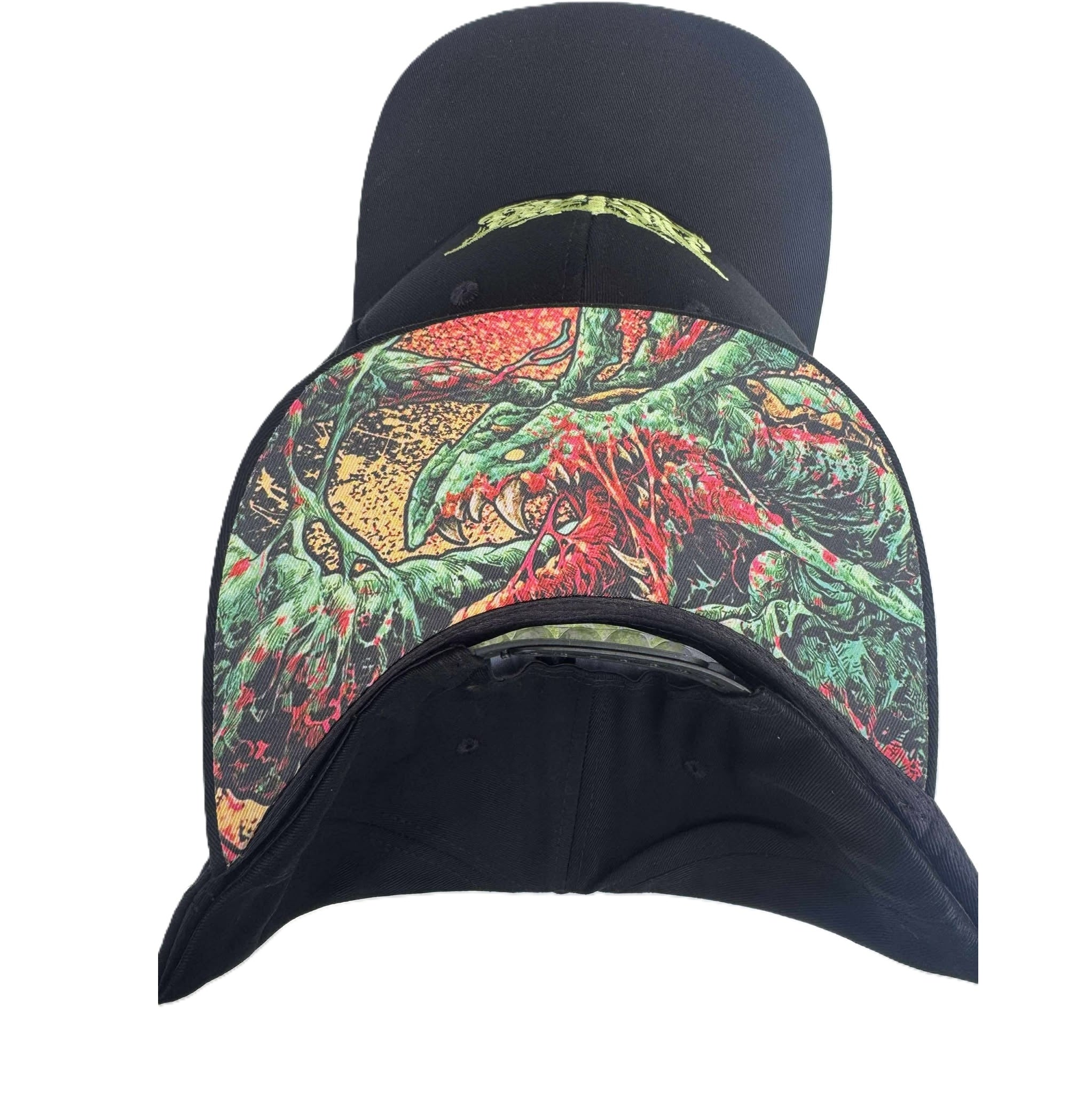 Black snapback. Distant embroidered logo. Artwork under brim print.