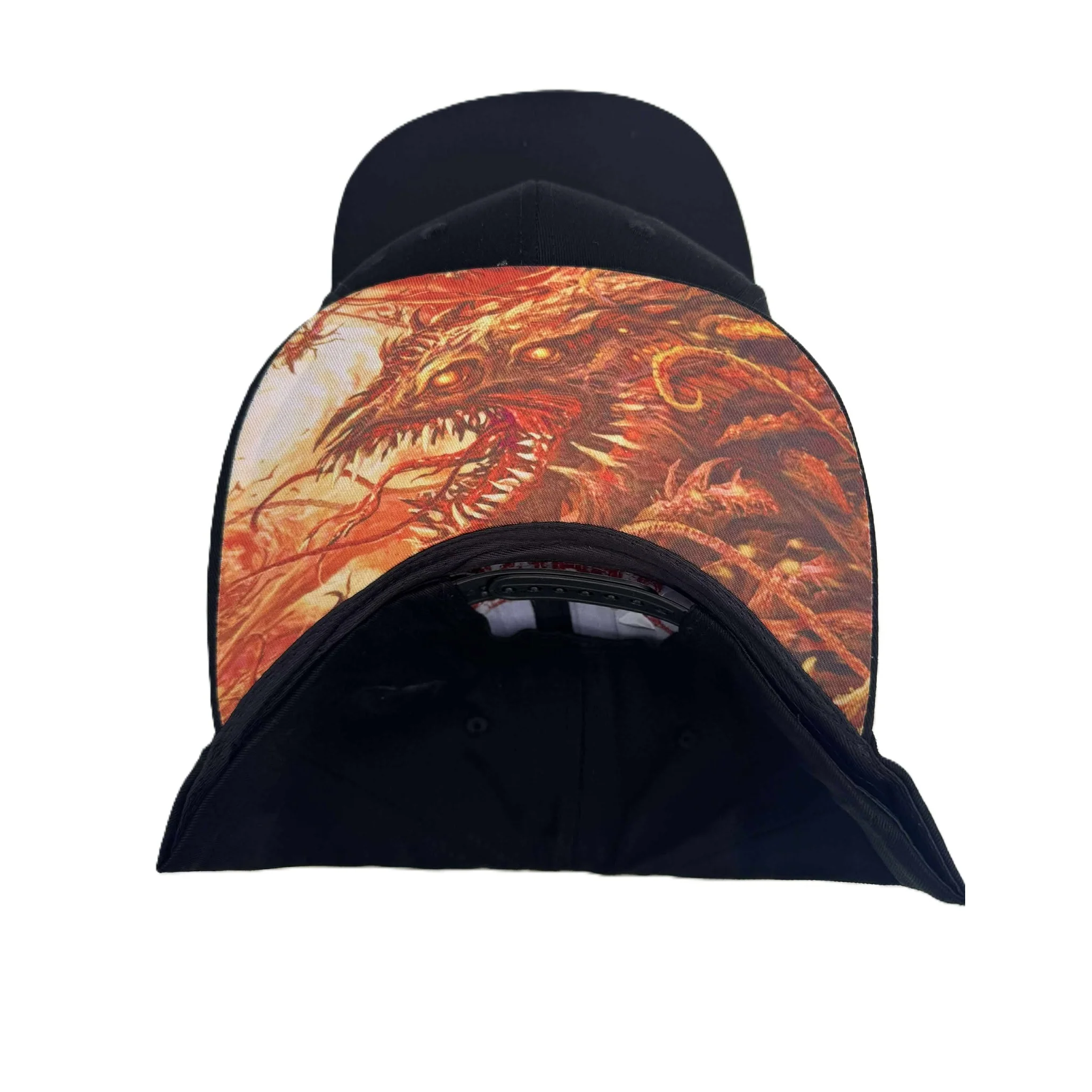 Black snapback. Distant embroidered logo. Artwork under brim print.
