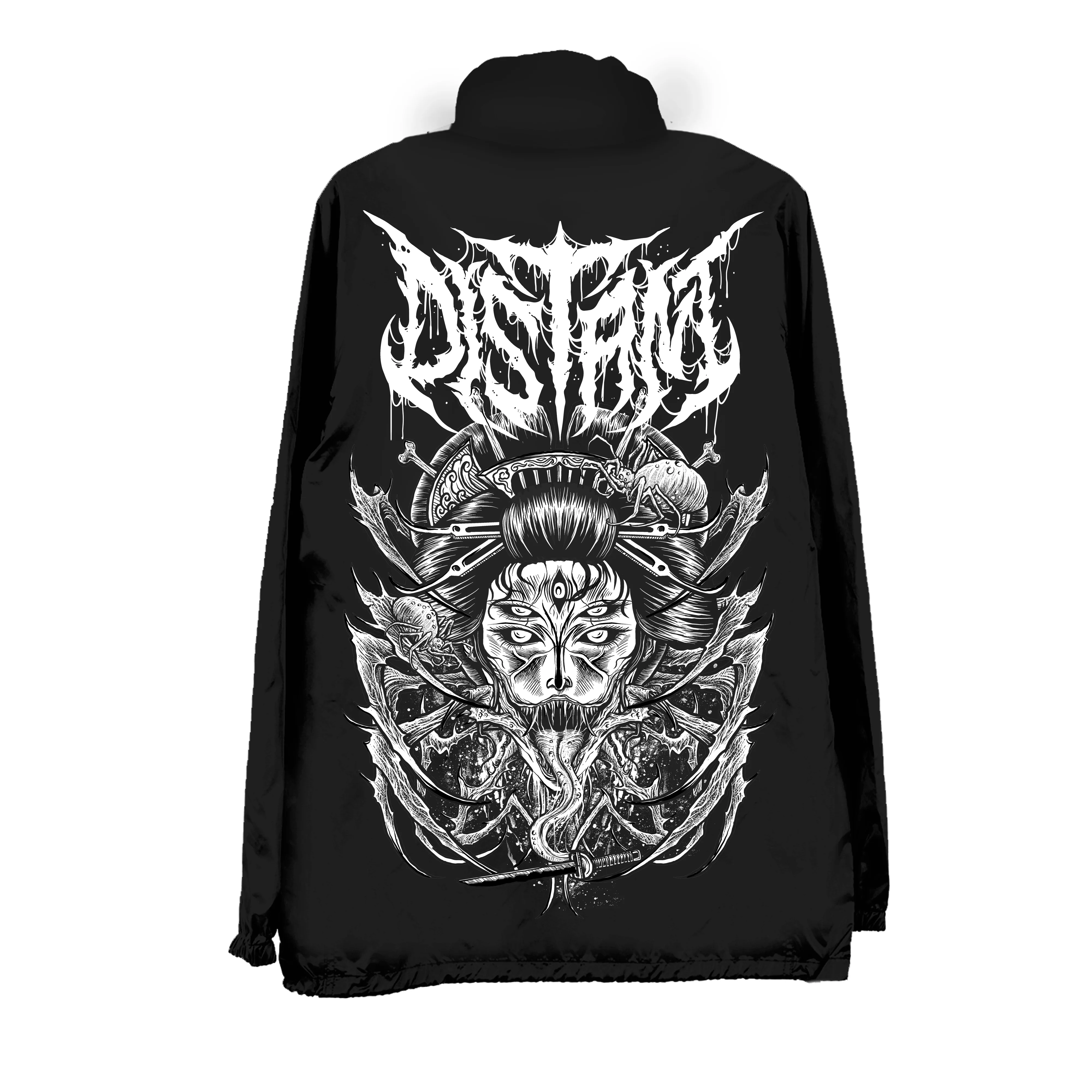 “GeishaSpider” windbreaker! 1-color, 2-location unisex on a black 100% nylon windbreaker printed in Gildan Hammer.